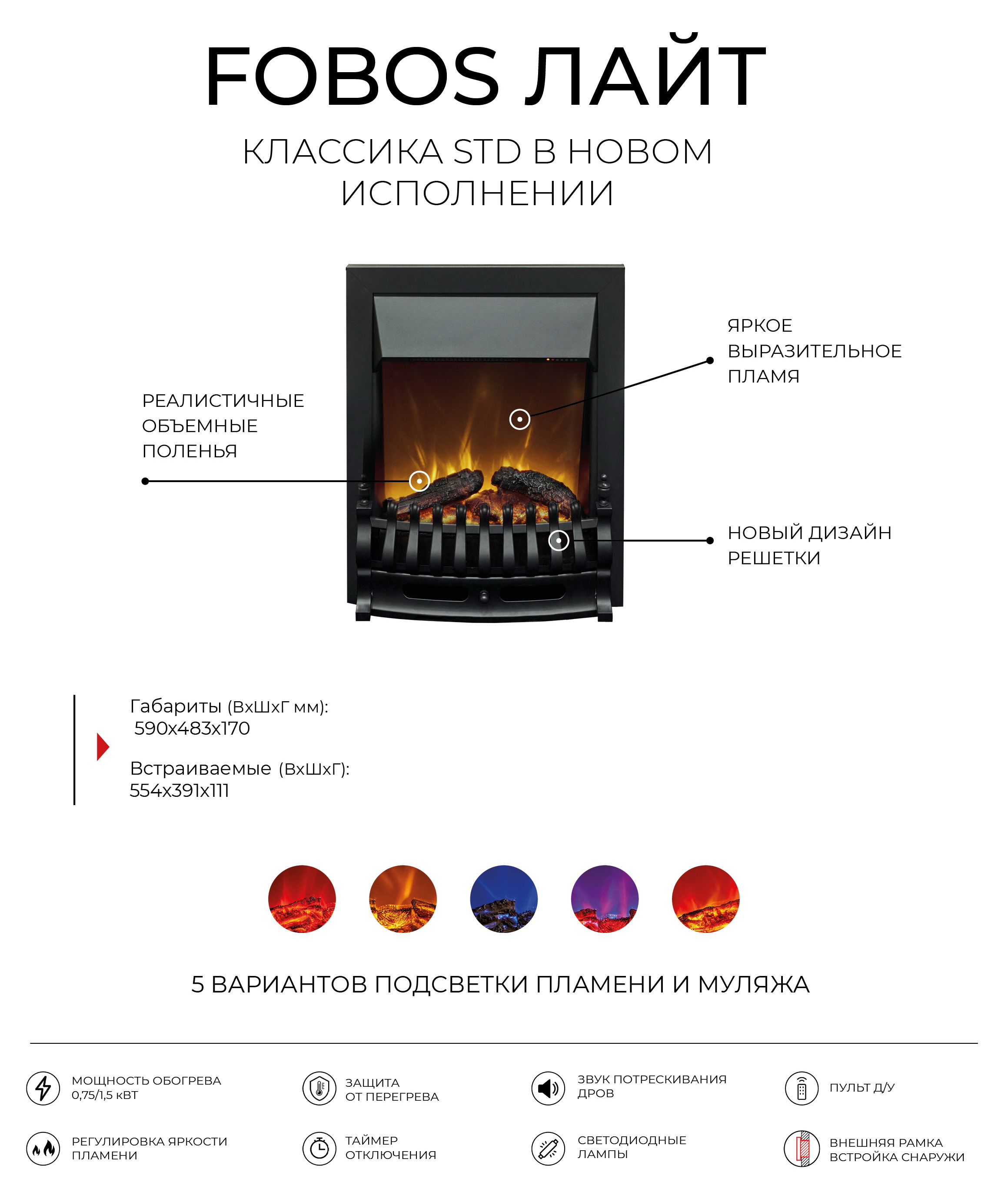Описание: Очаг классический с ярким реалистичным пламенем, защитой от перегрева, мощностью 0,75-1,5 кВт., стаймером отключения, звуком потрескивания дров, светодиодной подстеткой, пультом д.у.
